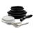 Conjunto pega removível de 10 peças: 2 frigideiras 16/18 cm, 3 poeles 20/22/26 cm, 1 alça removível, 2 tampas herméticas 16/18 cm, 1 espátula (utensílio), 1 colher com pernas (utensílio) - materiais de alumínio - Todas as fontes de calor, incluindo indução - Interior: revestimento antiaderente em favo de mel sem PFOA