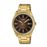 ESTILO:Fashion MOVIMENTO:Quartzo MAT CAIXA:Resina COR CAIXA:Dourado DIAMETRO:38.5 Material Caixa:Castanho VIDRO:MineralEXIBICAO:Analógico MAT BRACELETE:Aço RESISTENCIA:5 ATM CALENDARIO:Data COR BRACELETE:Dourado