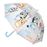 Guarda-chuva para criança, em material impermeável transparente, com estampado colorido das personagens principais da série Bluey. Fecho/abertura manual. Cabo resistente de plástico para segurar e com design Bluy. Presilha com mola de pressão para prender. Os dias de chuva são mais fixes com um guarda-chuva divertido! Medida: 53cm.